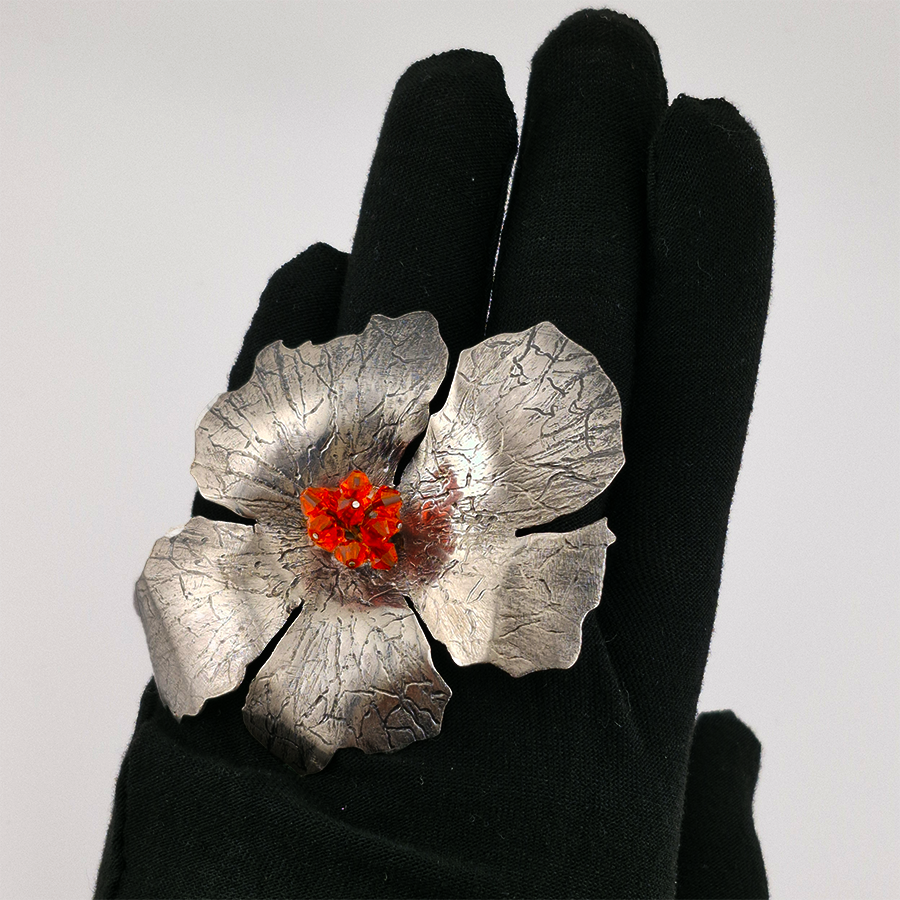 Please note that the crystal's colour is bright, deep orange while the patinated silver ring is light-medium grey. However, the appearance of the colour may vary depending on the lighting conditions in which it is viewed. We recommend considering this variability when purchasing, as the crystal may look different in natural, artificial, or other settings. We appreciate your understanding.